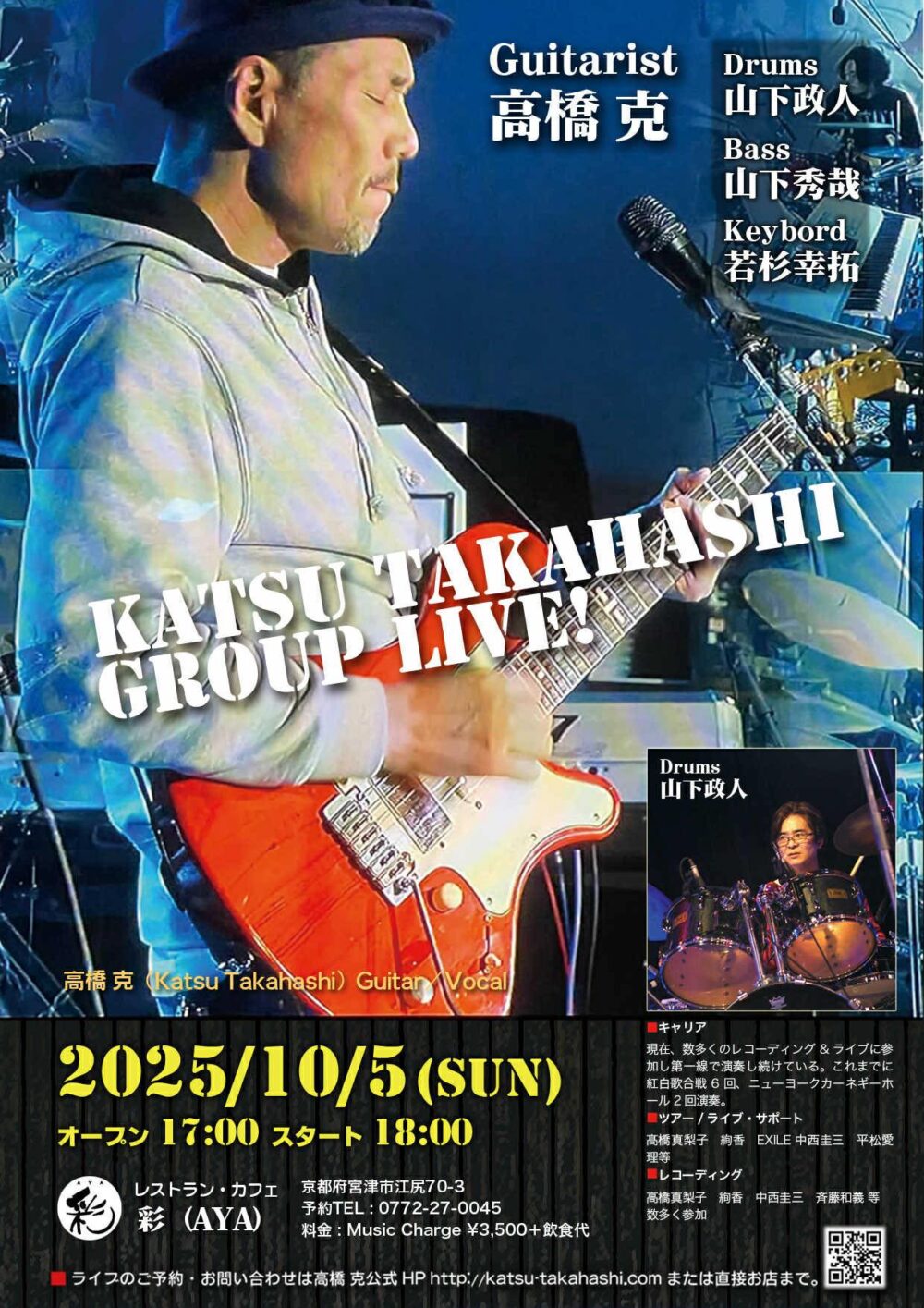 Gr&Vo高橋克さんのライブに参加します! Drums山下政人、Bass山下秀哉、Keyboard 若杉幸拓 お申し込みは、高橋克さんのホームページまたはお店までお願いいたします。